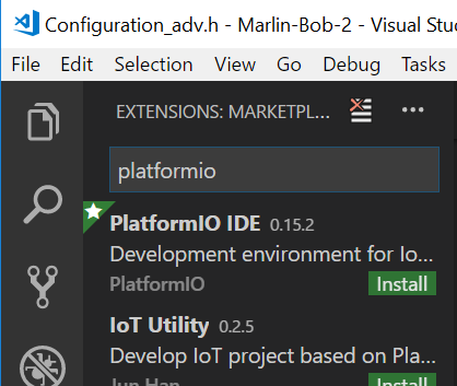 Type platformio into the search box and click on Install under PlatformIO IDE.
